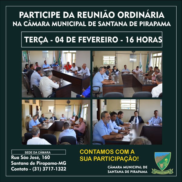 A Câmara Municipal de Santana de Pirapama convida toda população para participar da Reunião Ordinária que será realizada nesta terça-feira (04/02) à partir das 16:00 horas.